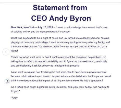Otra reacción que hubo fue un comunicado por parte de Andy Byron en el que ofrecía disculpas y arrepentimiento por sus acciones.