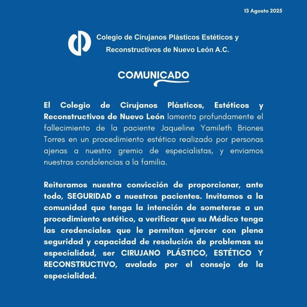 El Colegio de Cirujanos Plásticos, Estéticos y Reconstructivos de Nuevo León (CCPERNL) lamentó el fallecimiento de Jaqueline Yamileth Briones Torres, una joven de 25 años que murió tras someterse a una cirugía estética en Monterrey. El organismo desconoció al médico que la operó, señalando que no forma parte del gremio de especialistas certificados.